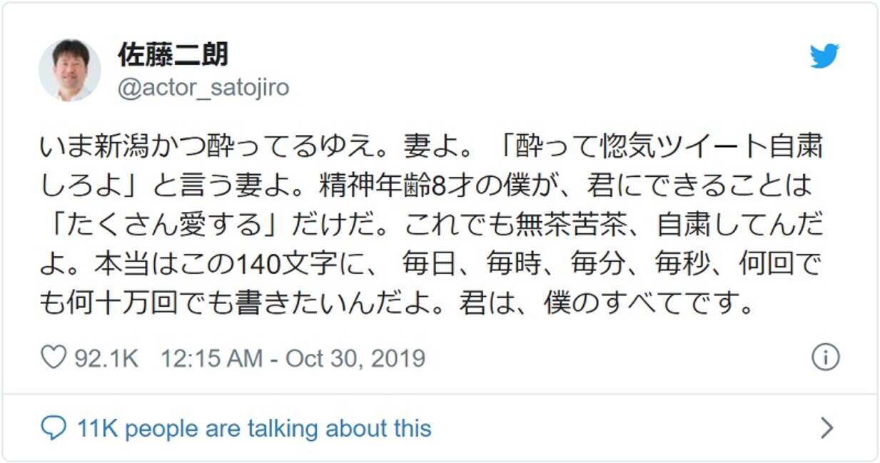 佐藤二朗の惚気ツイート再び 奥さんに自粛促されるも愛の言葉連発 19年10月30日 エキサイトニュース